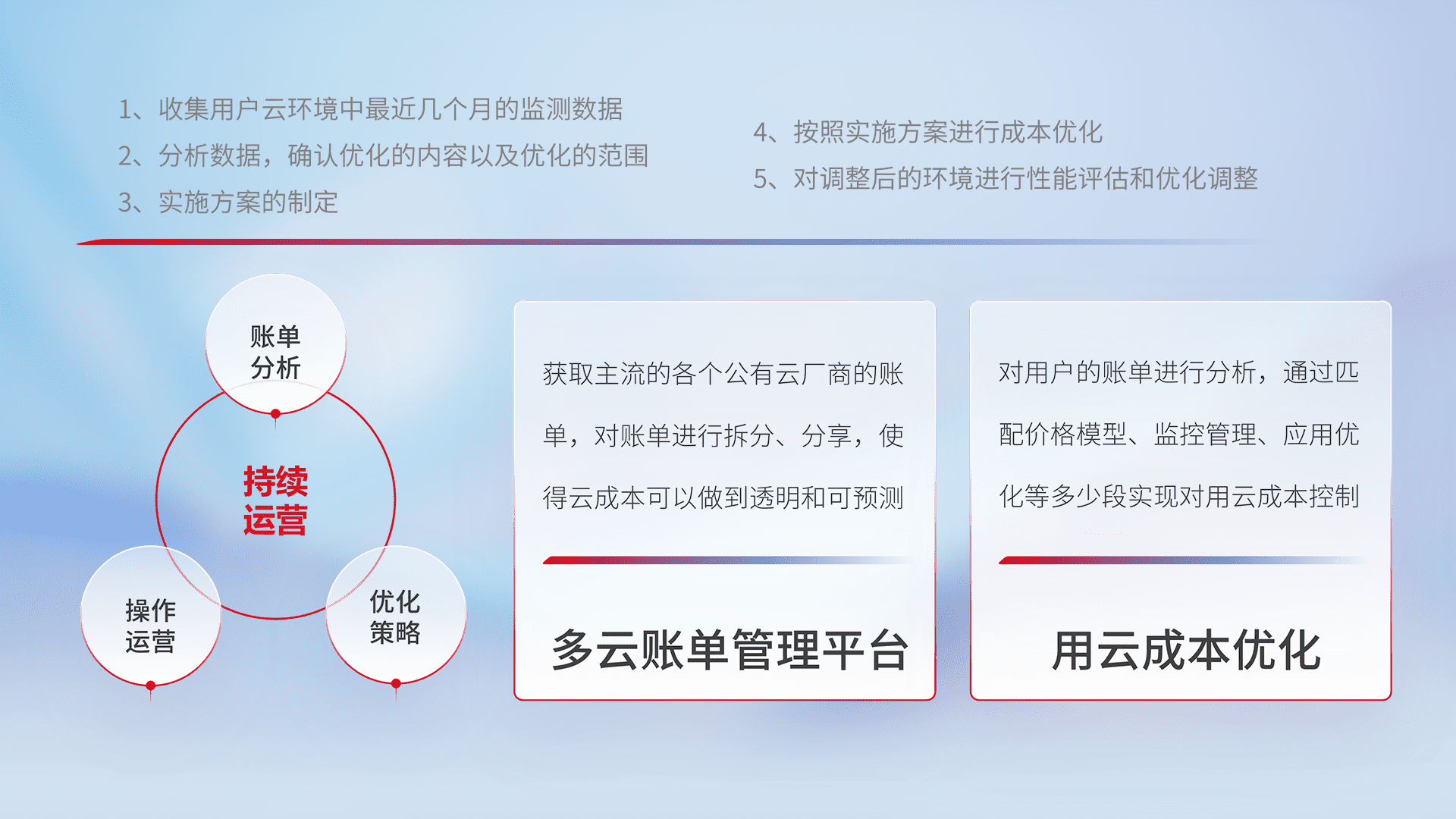 通过多云纳管,,以统一的资源数据模型把客户的云资源进行抽象和封装,,,,进而实现对多云资源的统一操作,,保障云资源管理的可靠性、、、稳定性与可用性。。。量身定制化运维内容,,,,配置、、、开发运维、、补丁管理、、备份、、、、监控、、、认证和访问管理、、、审计和日常巡检等,,,,保障在用云过程中的可靠度,,,稳定度以及高可用率。。